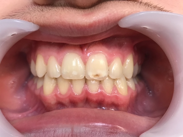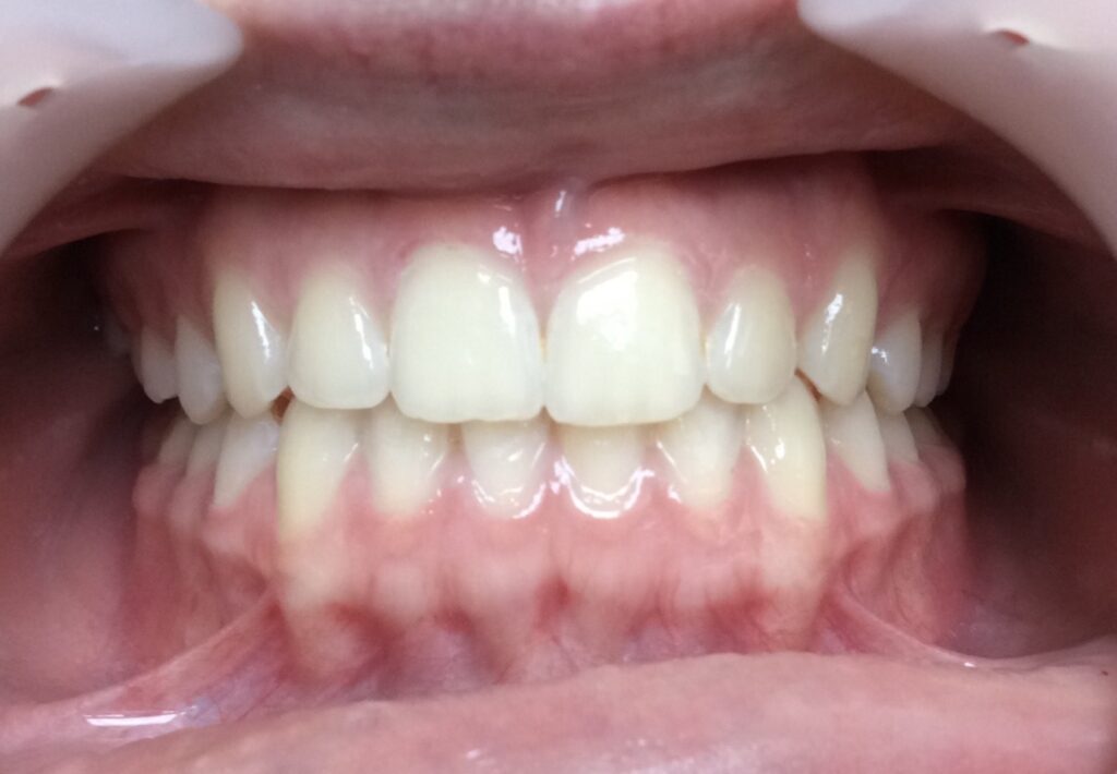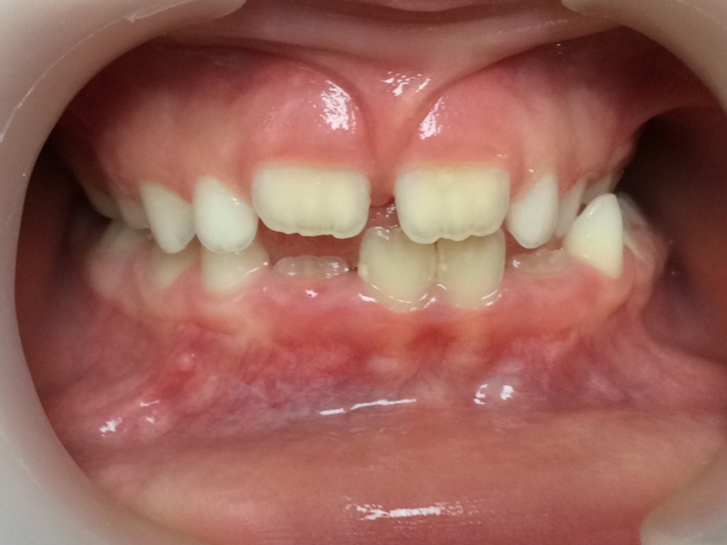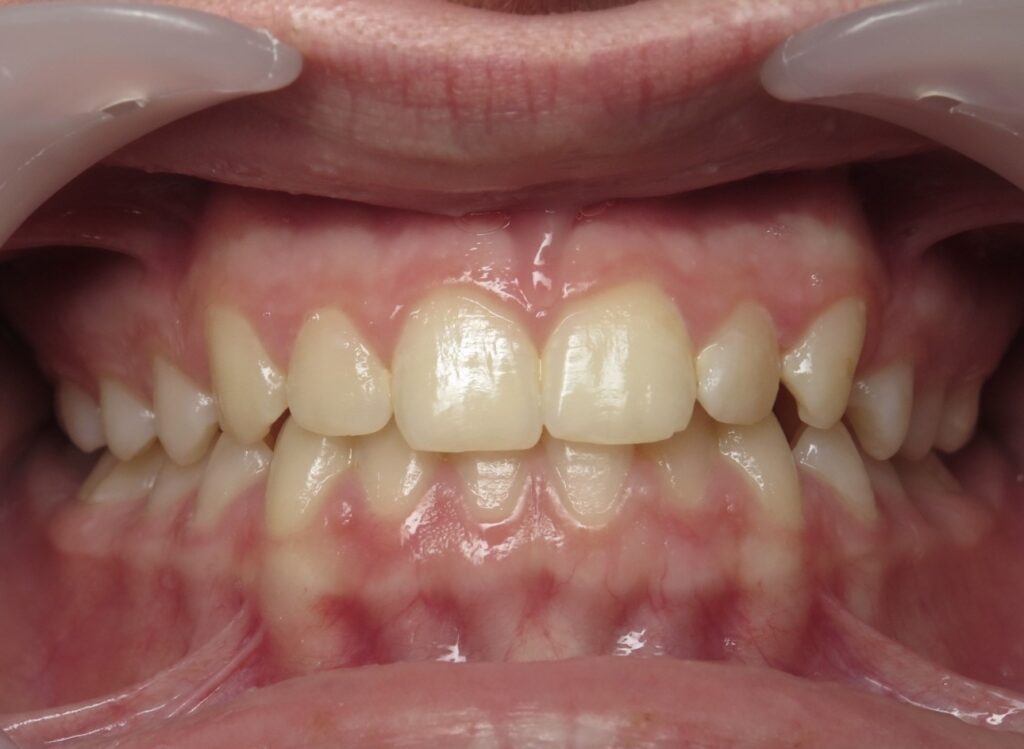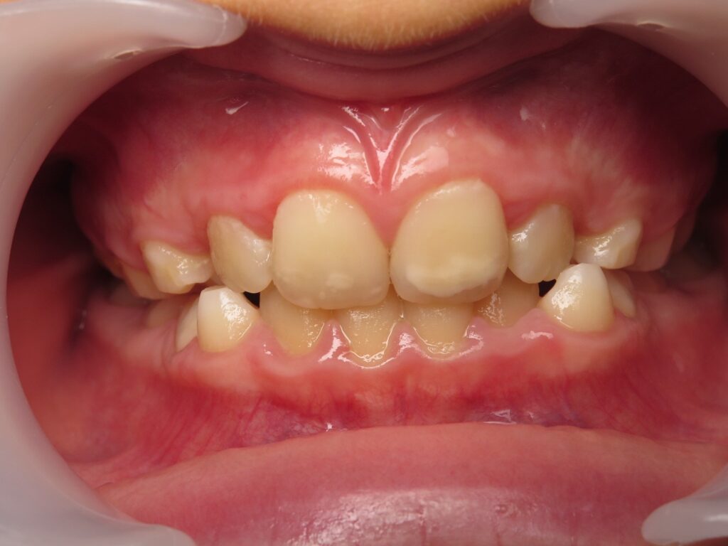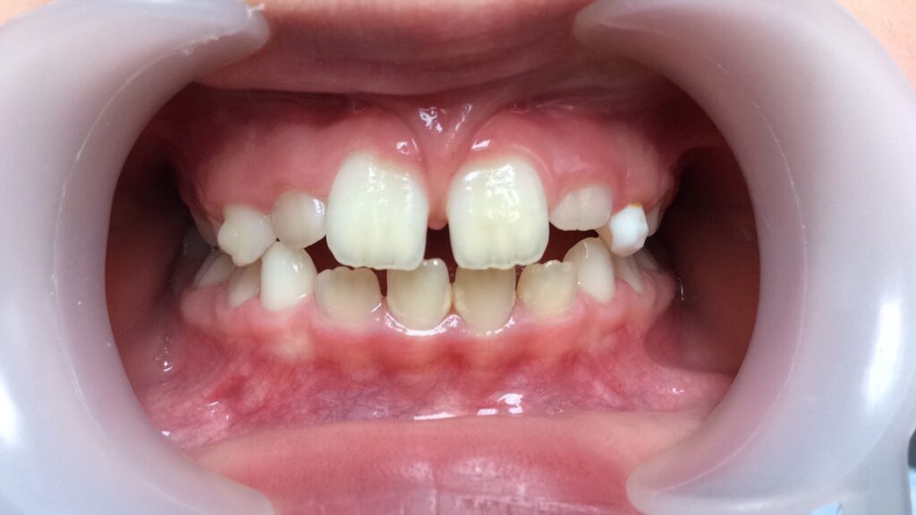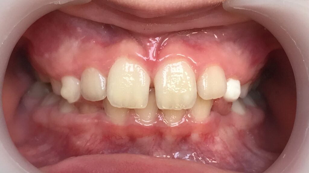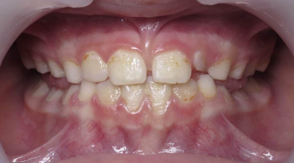 La photo intermédiaire permet de voir que la situation en denture mixte était bien plus favorable qu’au départ. Quelle dentition aurait eu ce patient si on l’avait traité seulement à 12 ans ? et toutes les tensions dans son corps qui accompagnent ce genre de cas auraient surement perturbé sa croissance générale.